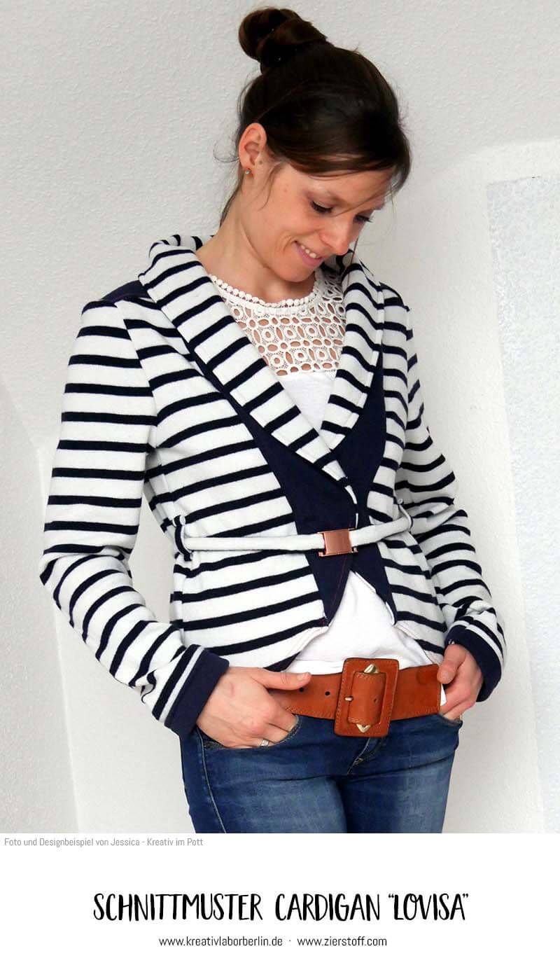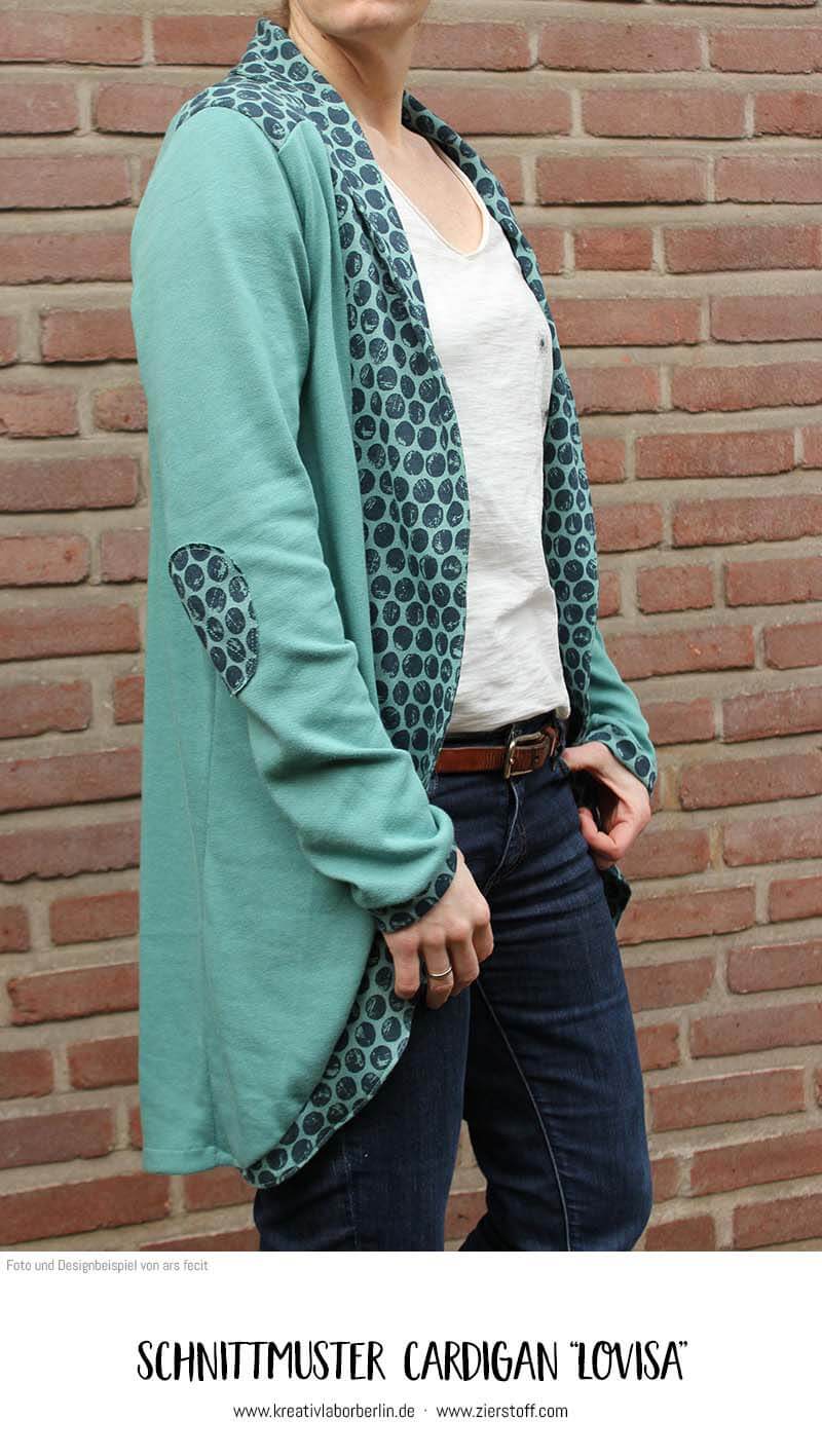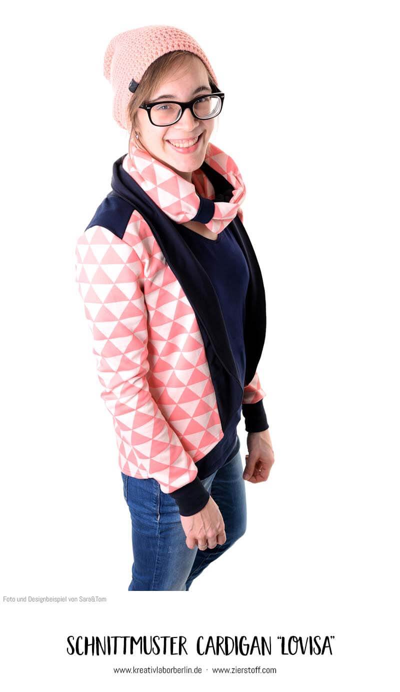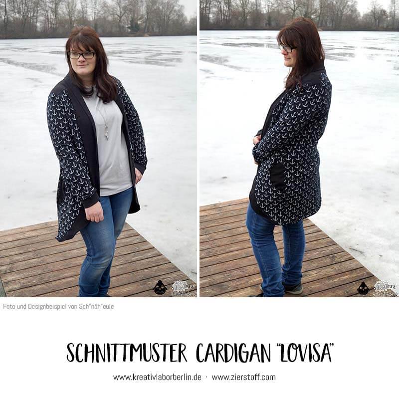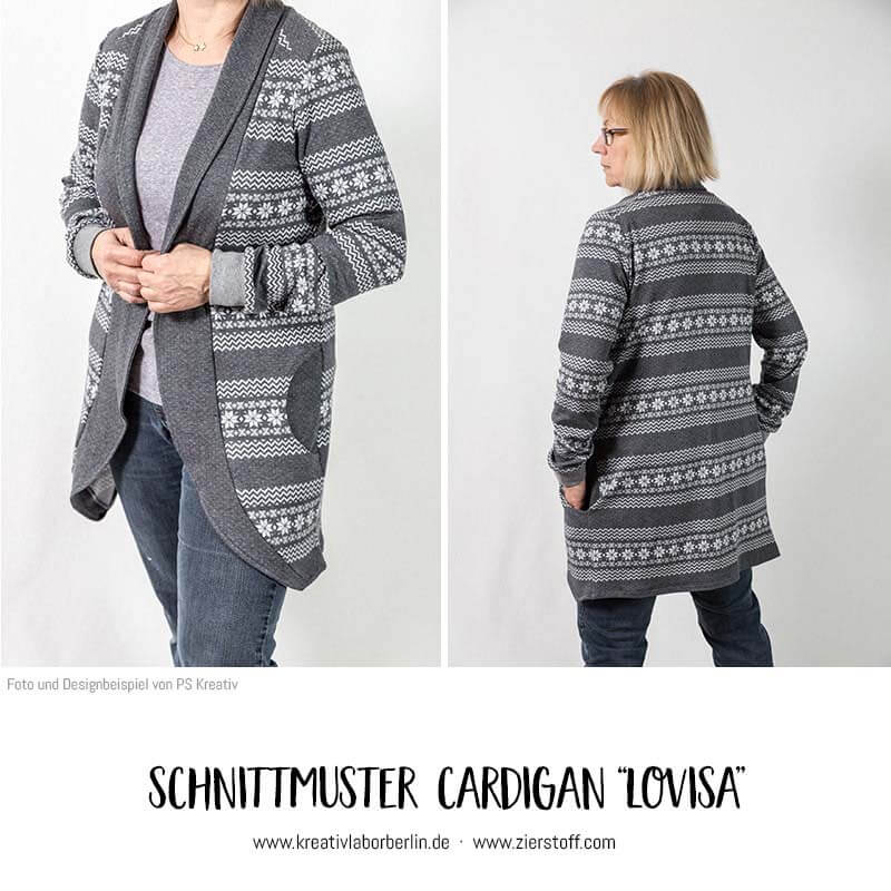 Dies ist wieder ein Gemeinschaftsprojekt von kreativlabor Berlin und Zierstoff. Die Idee für den ausgefallenen Cadigan / Jacke haben wir mit Julia gemeinsam umgesetzt. Mit dem Cardigan Lovisa nähst du Dir einen kuschligen Begleiter. Der Cardigan hat einen lässigen Schalkragen und wird offen getragen. Du kannst die Jacke entweder in der langen oder kurzen Version nähen. Für die lange Version sind Eingriffstaschen vorgesehen, die Du aber auch einfach weglassen kannst. Die Ärmel schließen mit einem Bündchen ab. Der Cardigan hat eine lockere Passform und fällt schön lässig. Danke auch an die vielen Probenäher für die vielen kreativen Ideen…