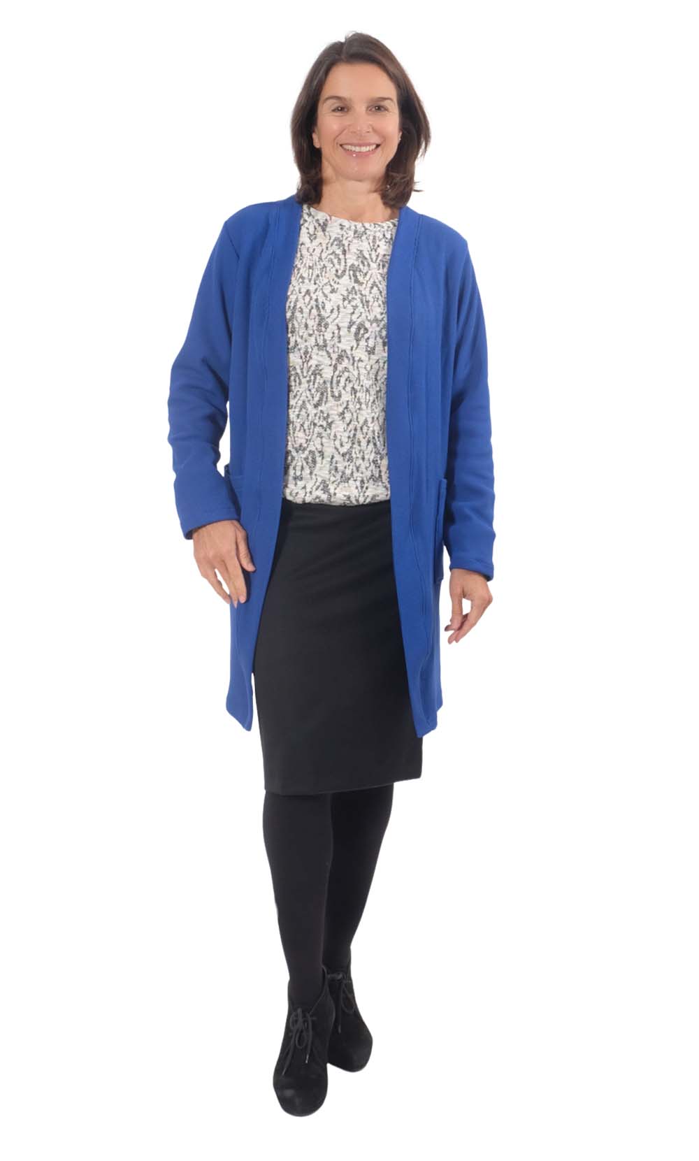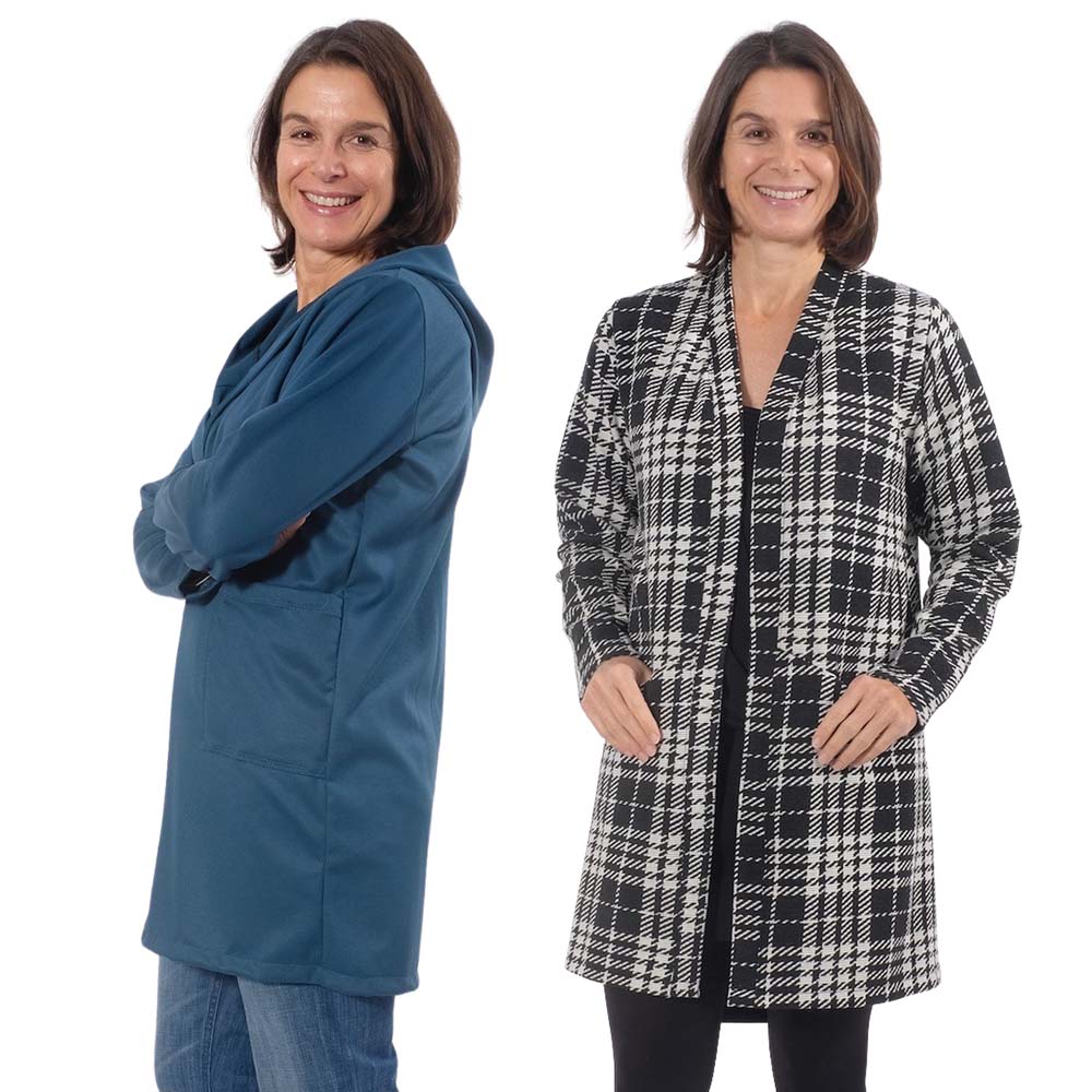 Dies ist eine sehr unkomplizierte Jacke. Du kannst sie mit oder ohne Kapuze nähen, mit Teilungsnaht und Tasche oder ohne Teilungsnaht und mit seitlicher Eingriffstasche. Die Jacke wird offen getragen, kann aber auch mit Knöpfen verarbeitet werden. Wir haben die fertige Brust und Saumweite angegeben. Bestimme einfach selber wie leger weit die Jacke am Ende sitzen soll. Die Länge kannst Du natürlich auch ganz einfach variieren. Wie unterschiedlich man diese tolle Jacke kombinieren und stylen kann könnt Ihr anhand des blauen Strickstoffes sehen.