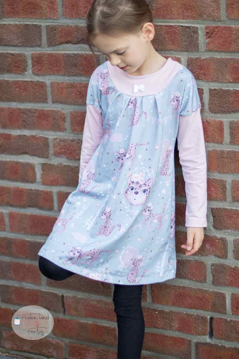 Du möchtest ein hübsches Jerseykleid für Mädchen nähen? Selbst Anfänger können sich hier ranwagen. Du kannst den Halsausschnitt / Passe oben verschieden verarbeiten. Im Ebook werden alle Varianten ganz genau erklärt. Spiele doch mit verschiedenen Stoffen und nähe ein ganz besonderes Unikat? Dieses Kleid kannst Du in jeder Jahreszeit anziehen, mit oder ohne Strumpfhose oder mit langen oder 3/4 Ärmeln. Und wer kreativ ist der kürzt sich das Kleid einfach auf Blusenlänge und lässt die Ärmel einfach weg, siehe Beispiel aus schwarzem Chiffon. Und wer möchte kann den Ausschnitt ja auch jederzeit etwas tiefer zuschneiden, damit bekommt das Teil auch gleich einen ganz anderen Look.