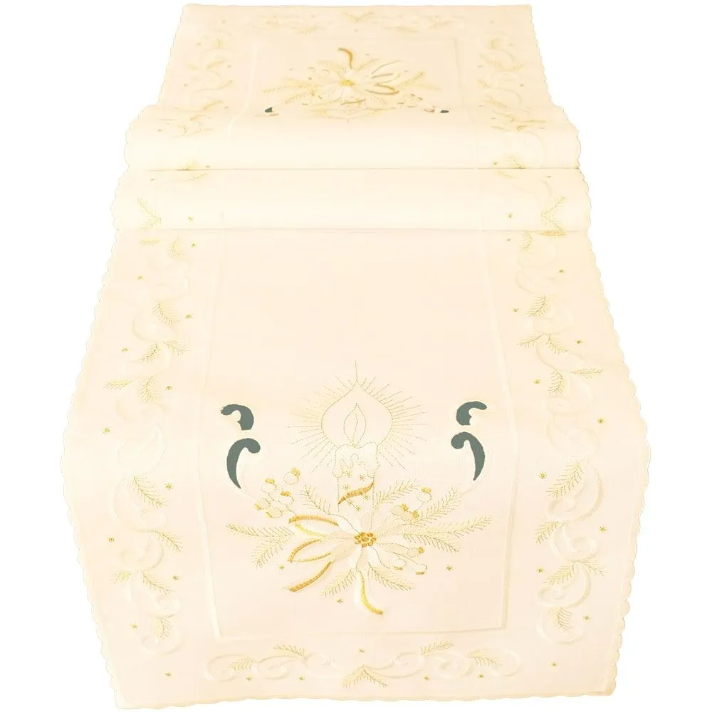 - Tischläufer / Mitteldecke mit Verzierungen und Kerze als Motiv – ecru gold gestickter Läufer mit winterlicher Stickerei